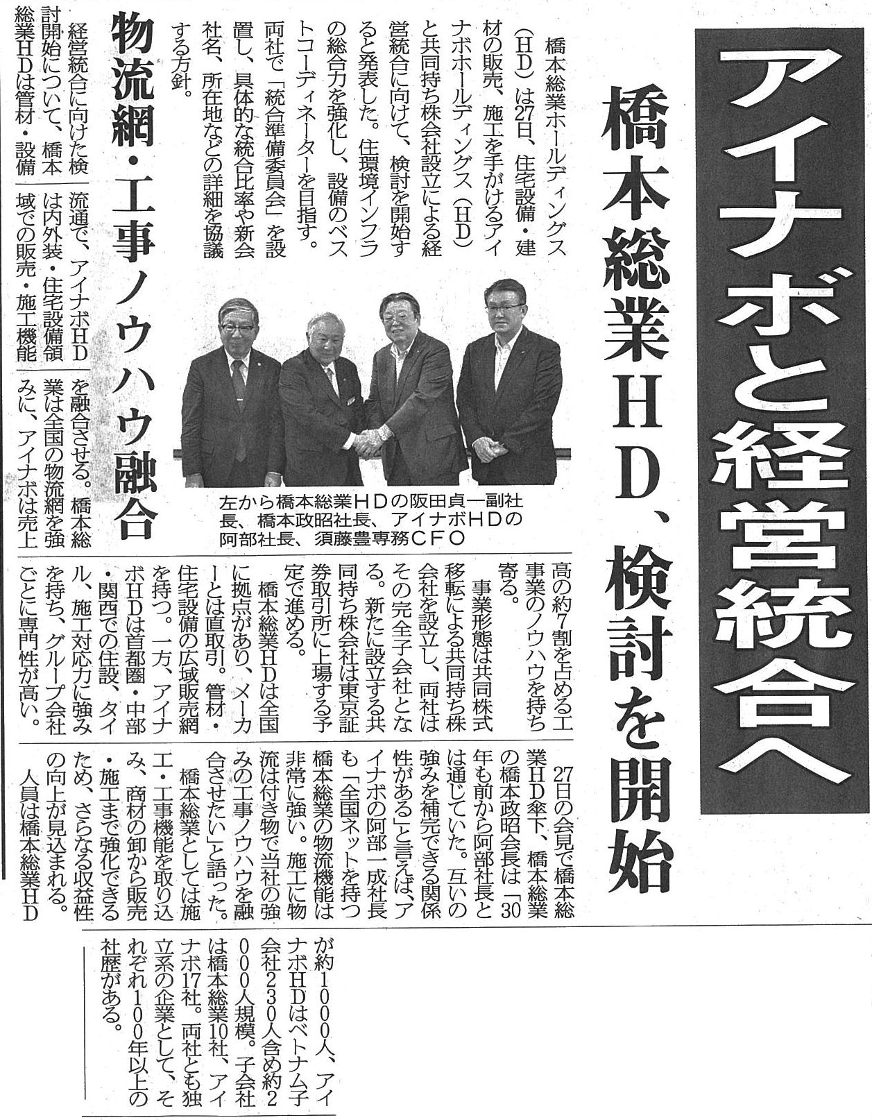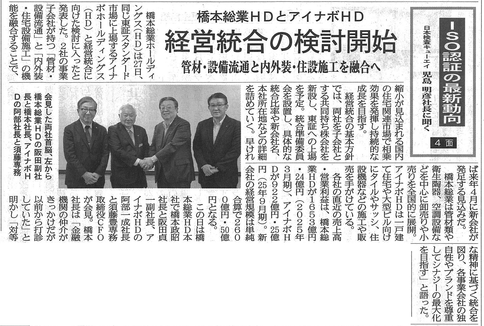 外装・内装工事機能を備えた住設商社アイナボHDと 管工機材商社橋本総業HDが 経営統合(共同持株会社設立)に向けた検討開始を発表