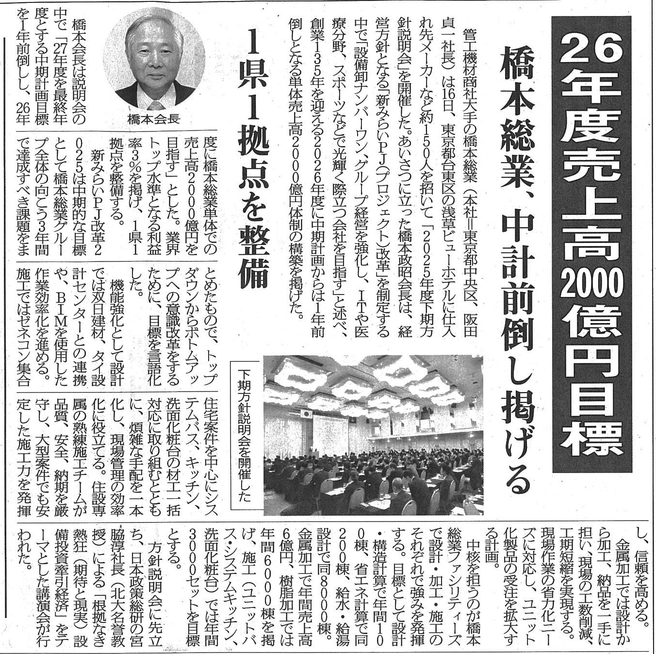 26年度売上高2000億円目標 橋本総業、中計前倒し掲げる
