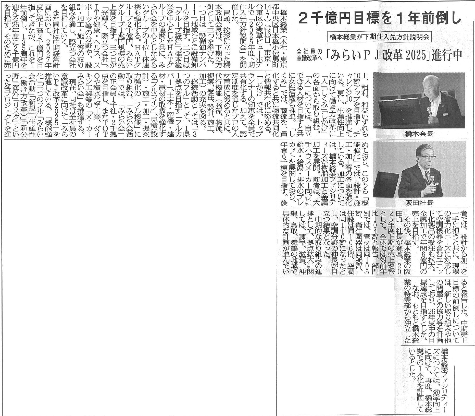 2000億円目標を1年前倒し 橋本総業が下期仕入先方針説明会 全社員の意識改革へ「みらいPJ改革2025」進行中