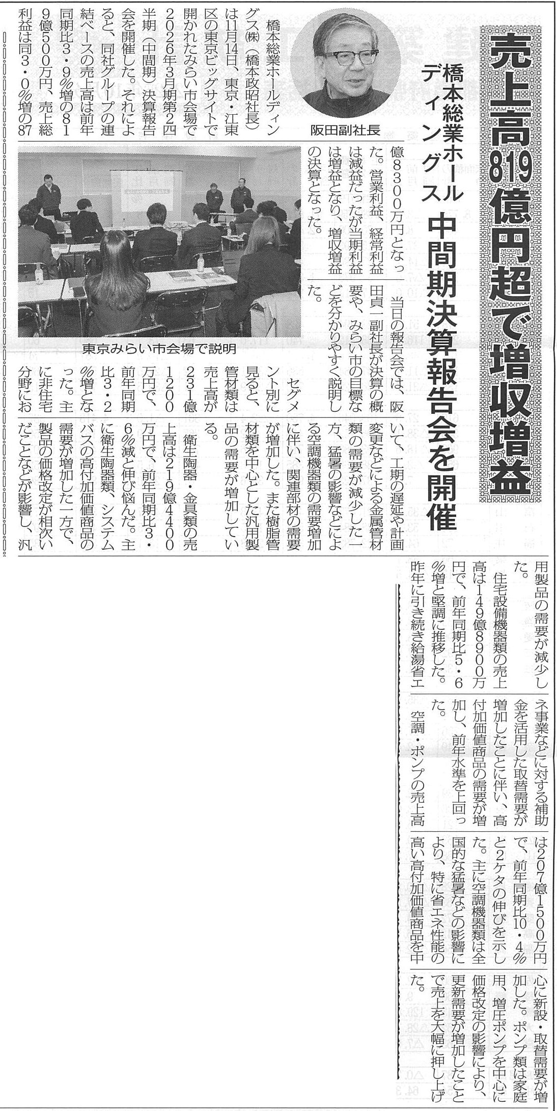 売上高819億円で増収増益 橋本総業ホールディングス中間期決算報告会を開催