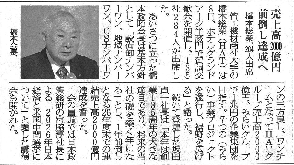 売上高2000億円前倒し達成へ 橋本総業、284人出席